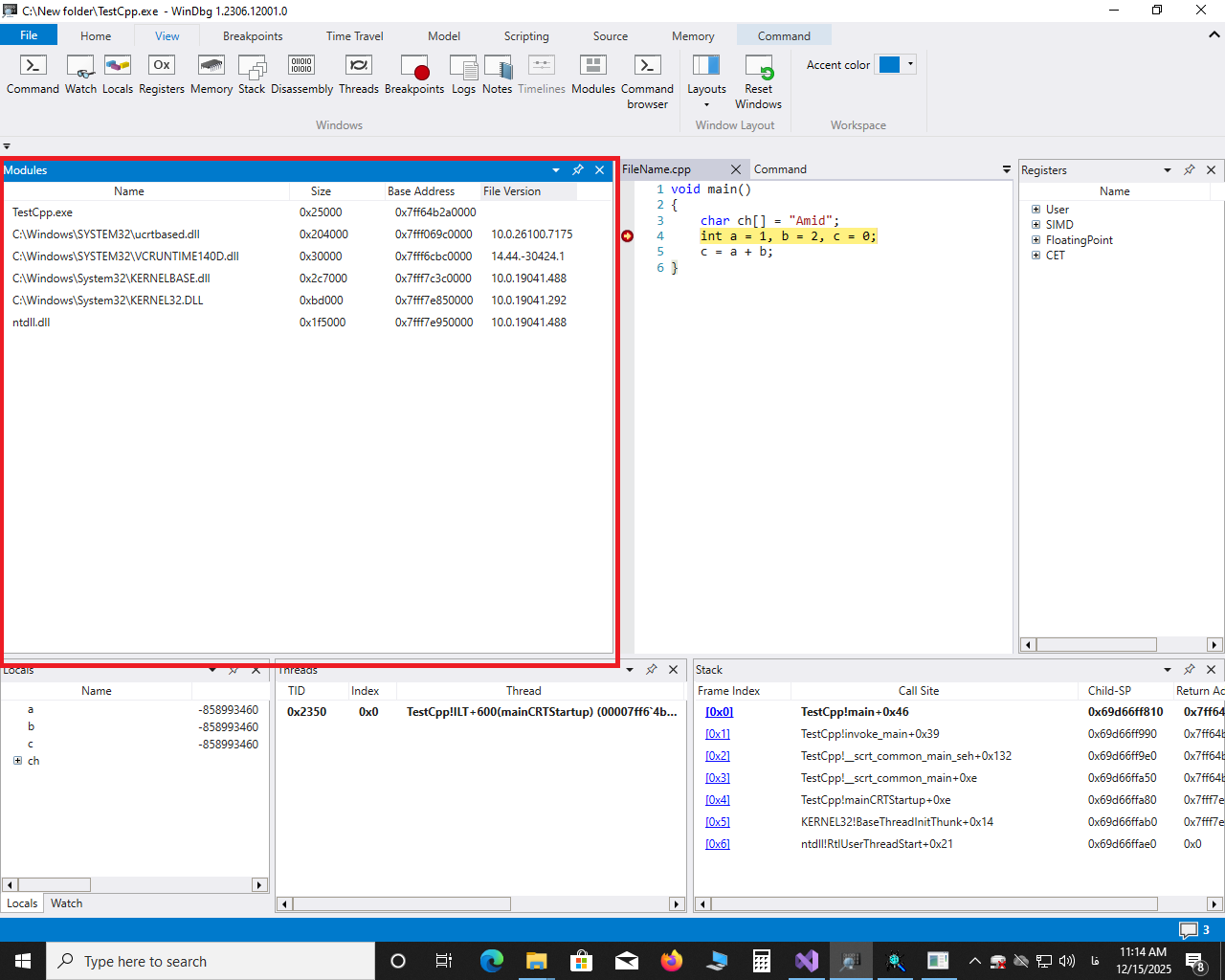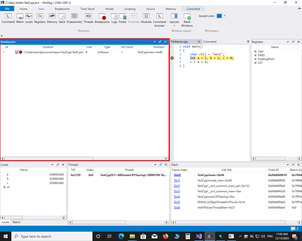 از بخش Breakpoints برای مشاهده، فعالسازی و پاک کردن نقاط توقف (Breakpointها) استفاده میشود.