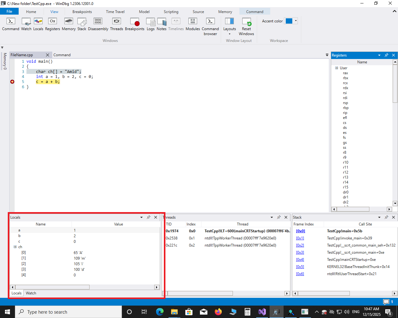 بخش Locals اطلاعات مربوط به تمام متغیرهای محلی در محدوده (Scope) فعلی را نمایش میدهد. این بخش همچنین مقادیر متغیرهایی را که در اجرای قبلی کد تغییر کردهاند، برجسته (Highlight) میکند تا تغییرات بهراحتی قابل تشخیص باشند.