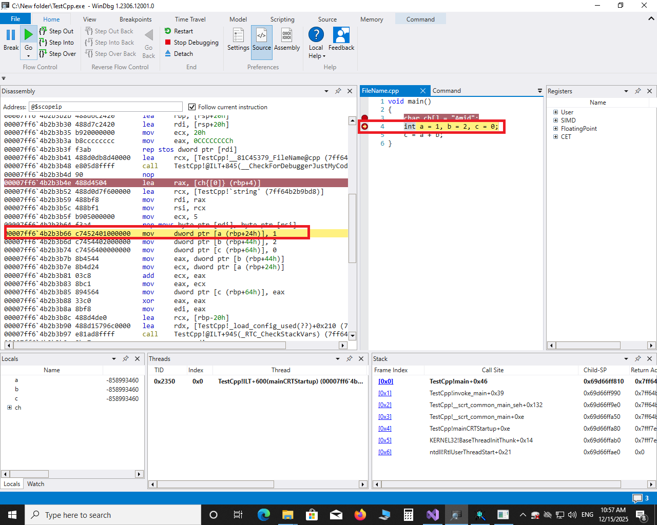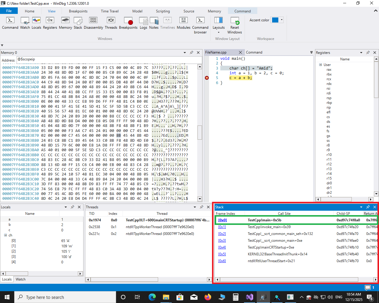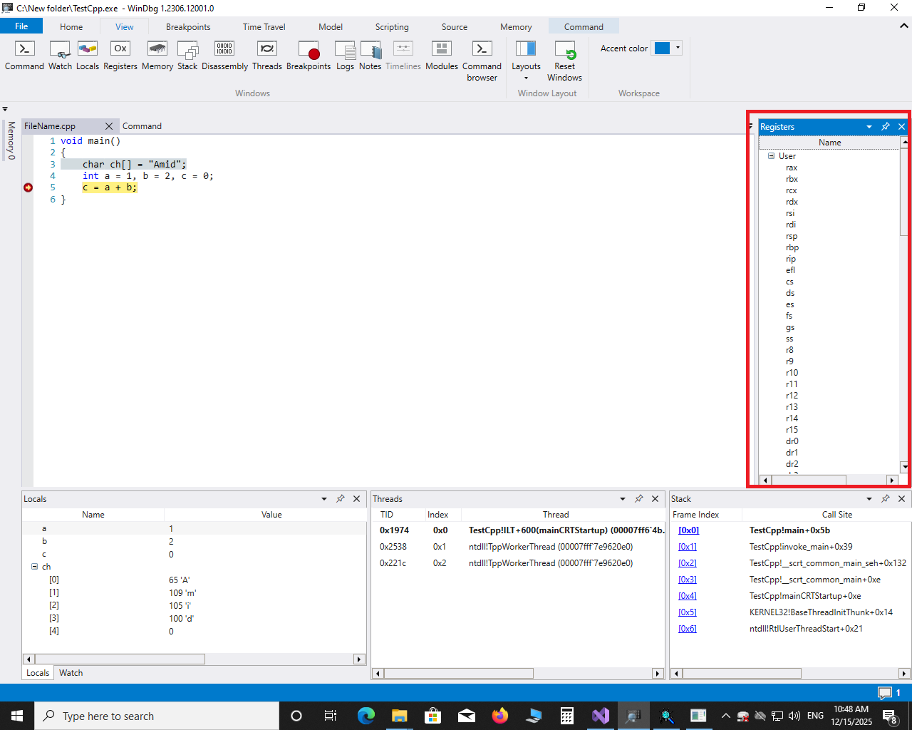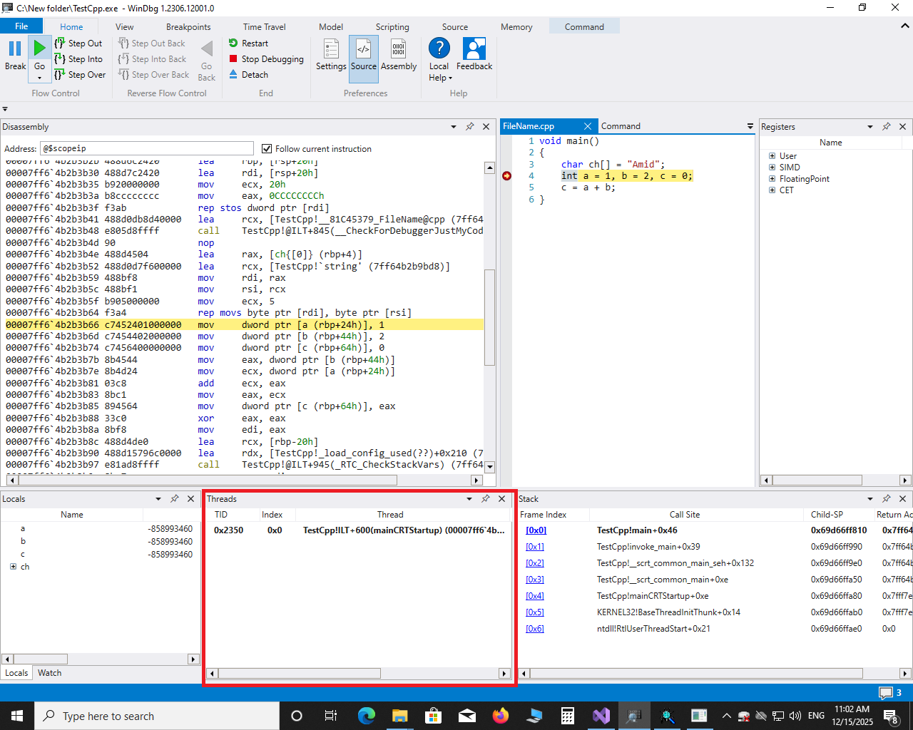 بخش Disassembly دستور جاری (Current Instruction) را برجسته میکند و هنگام اسکرول کردن، موقعیت آن دستور حفظ میشود تا راحتتر بتوانید جریان اجرای کد ماشین را دنبال کنید.