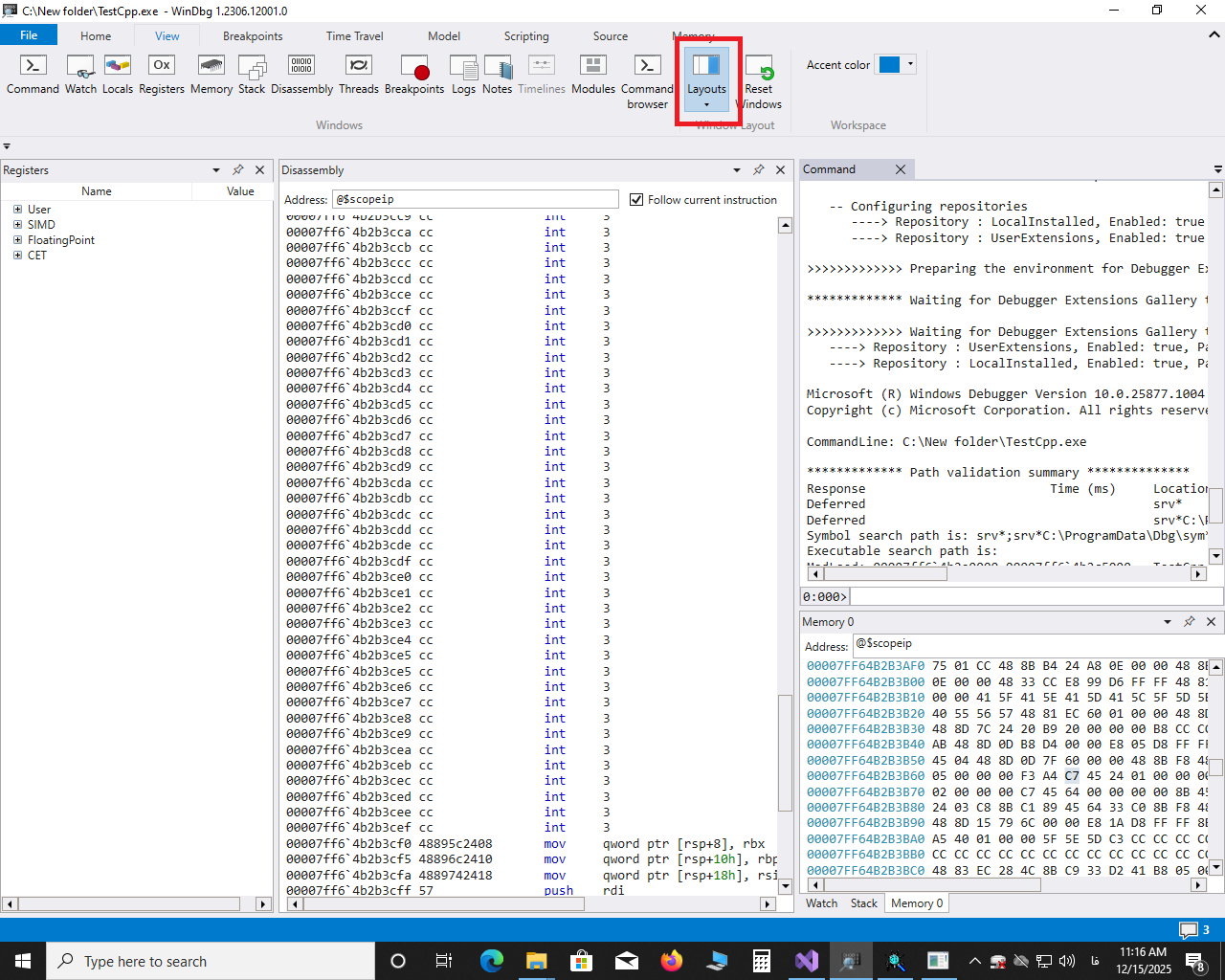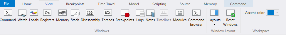 از گزینه Reset Windows برای بازنشانی پنجرههای دیباگر به موقعیتهای پیشفرض استفاده میشود.