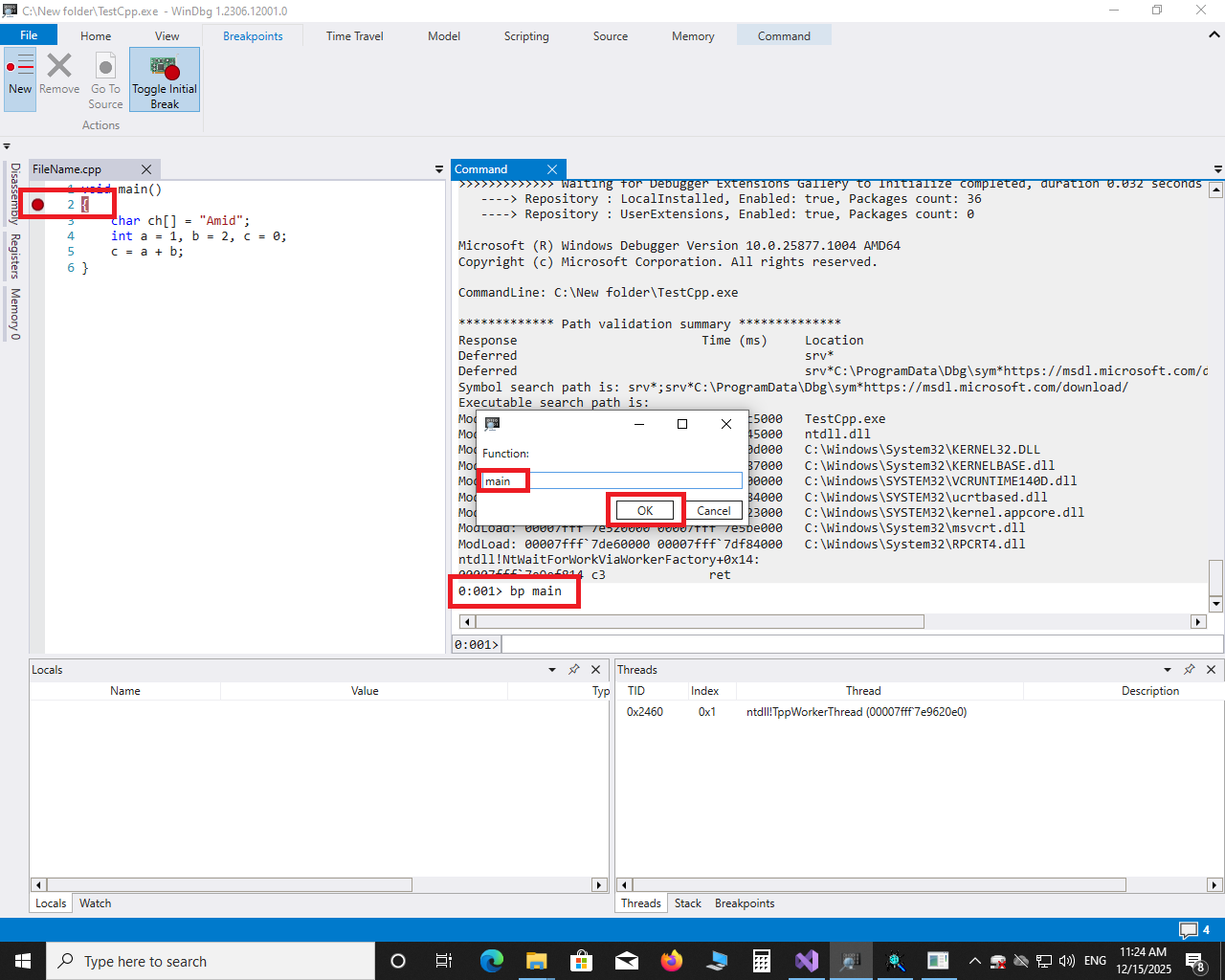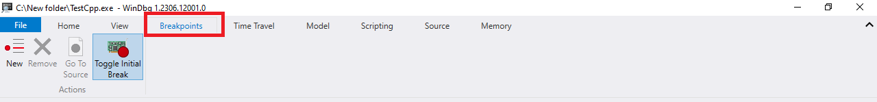 از منوی Breakpoints برای ایجاد نقاط توقف جدید و حذف نقاط توقف موجود استفاده میشود. همچنین میتوان نقطه توقف اولیه (Initial Breakpoint) را فعال یا غیرفعال کرد.