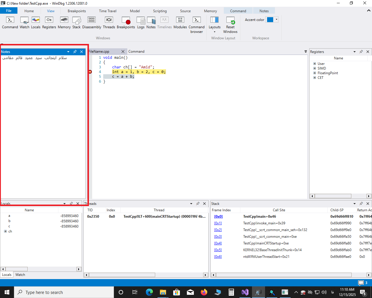 از بخش Notes برای باز کردن یک پنجره یادداشتبرداری استفاده میشود تا بتوانید نکات و توضیحات خود را هنگام دیباگ ثبت کنید.