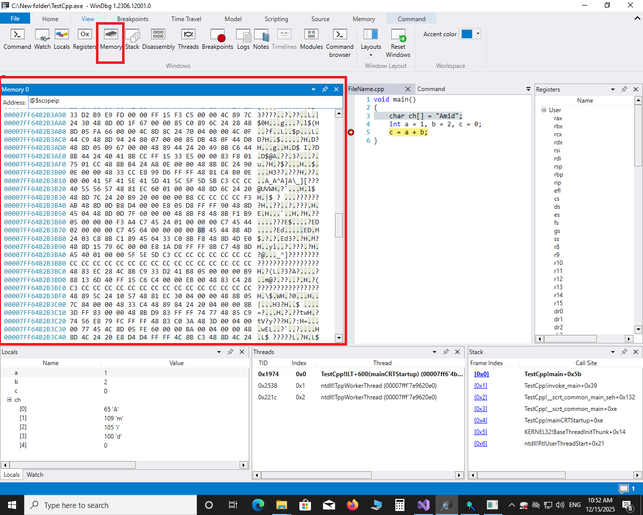 از بخش Memory برای نمایش مکانهای حافظه استفاده میشود. علاوه بر وارد کردن آدرس حافظه، میتوانید از مقادیر شبهرجیستر (Pseudo-register) مانند $scopeip و $eventip برای بررسی حافظه استفاده کنید. برای استفاده از مقادیر شبهرجیستر در Memory، علامت @ را قبل از آنها قرار دهید؛ به عنوان مثال: @$scopeip.