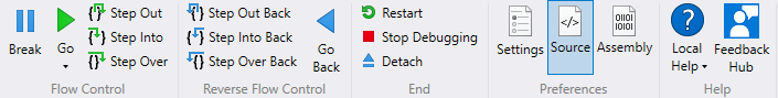 از دکمههای کنترل جریان برای وقفه انداختن (Break) در هدف دیباگ متصلشده، ادامه اجرای کد (Resume) و همچنین ورود به داخل کد (Step Into) یا خروج از آن (Step Out) استفاده میشود.