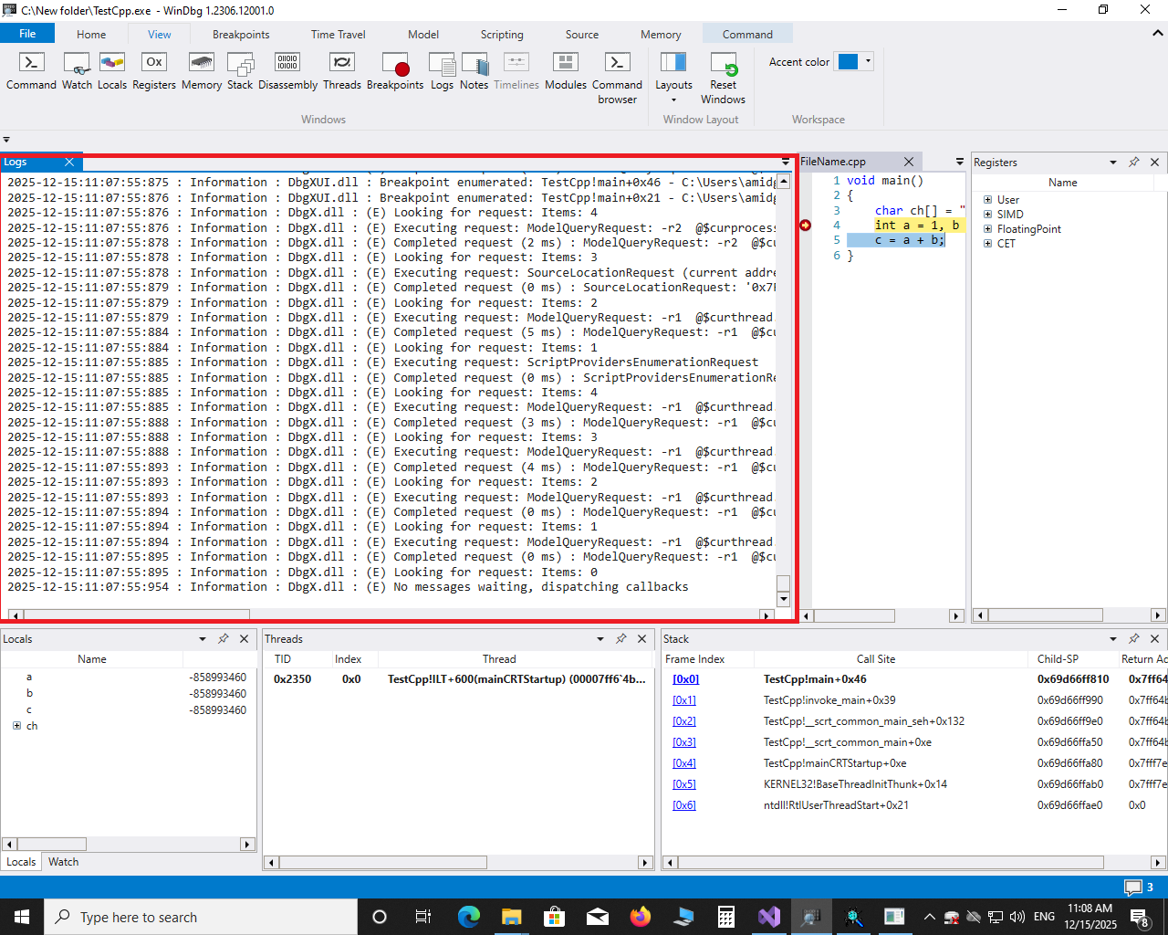 بخش Logs برای نمایش فعالیتهای داخلی WinDbg استفاده میشود. میتوانید از آن برای نظارت بر فرآیندهای طولانی و عیبیابی خود دیباگر بهره ببرید.