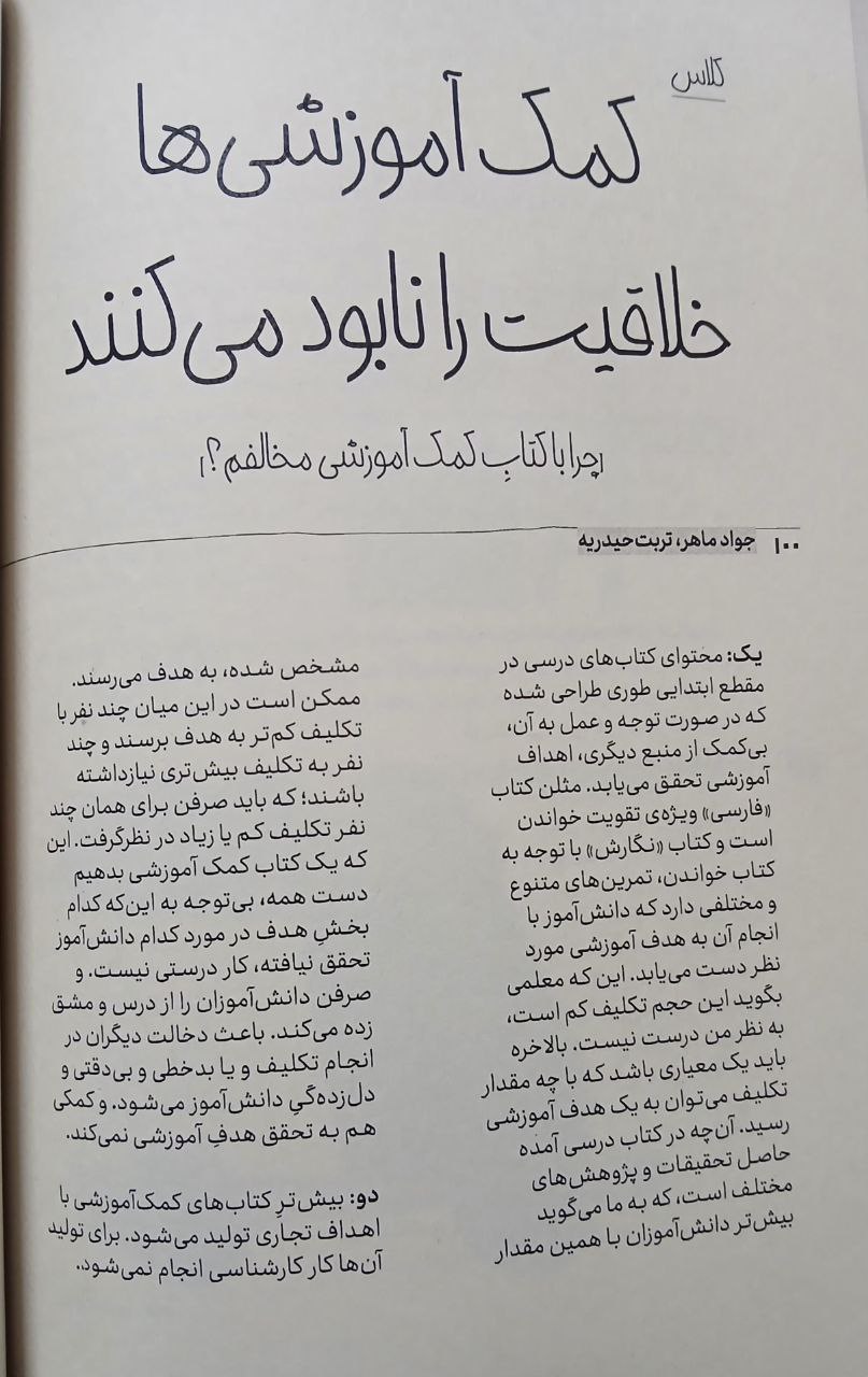 بنا به شش دلیل با استفاده از کتاب های کمک آموزشی مخالفم، و جای گزین مفیدی برای آن معرفی کرده ام. این ها را در مقاله ای سه صفحه ای نوشته ام که در شماره ی تازه ی مجله ی "عروسک سخنگو"( آبان و آذر 1404، شماره ی 353) چاپ شده است. یک صفحه را می گذارم این جا، بقیه را بخوانید آن جا.