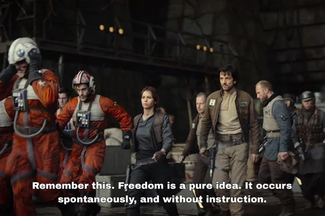 اعمال پراکندهی عصیان، همیشه در سراسر کهکشان در جریاناند؛ ارتشهایی هستند که حتی نمیدانند به مبارزه پیوستهاند. مردم شاید سازمانیافته نباشند، اما تجربهٔ مشترک سرکوب، آنها را ناخواسته متحد میکند.