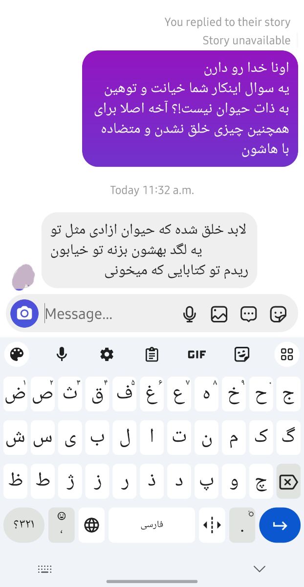 اول توضیح بدم که در چه مورد به استوری ریپ زدم یا واکنش نشون دادم، برای اینکه مردم رو تشویق میکرد به نگهداری حیوانات در منزل! خودش هم گربه داشت نه از این ملوس ها! از اینایی که تو کوچه و خیابان زیادن و اینکه بیارمشون خونه و نزاریم از گرسنگی و تنهایی بمیرم!!!! آخه چقدر این حرفش چرته!!!!