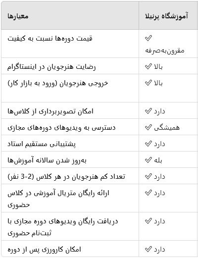 2. رضایت بالای هنرجویان نظرات هنرجویان در اینستاگرام و سایر شبکههای اجتماعی نشاندهنده کیفیت بالای دورههای پرنیلا است. اکثر هنرجویان پس از گذراندن دورهها، مستقیماً وارد بازار کار شدهاند.