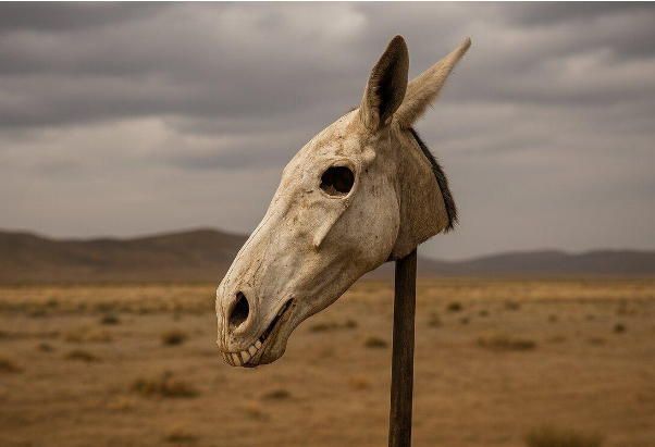 ایستاد و به پشت سرش نگاه کرد؛ جمجمهی الاغی بر سرِ چوبی نصب شده بود. جمجمه انگار میخندید. مرد وحشتزده نزدیک شد. ناگهان صدایی از میان استخوانهای خشک بیرون زد که می خندید.