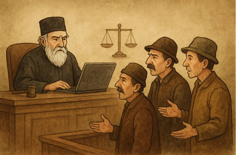 سه برادر پس از این حرف با یکدیگر شروع به کتککاری کردند و بر سر و روی هم مشت های محکم زدند چون بیل و یابا نبود. صدای ضربات مشت و فحشهای روستایی فضای دادگاه را پر کرد.
