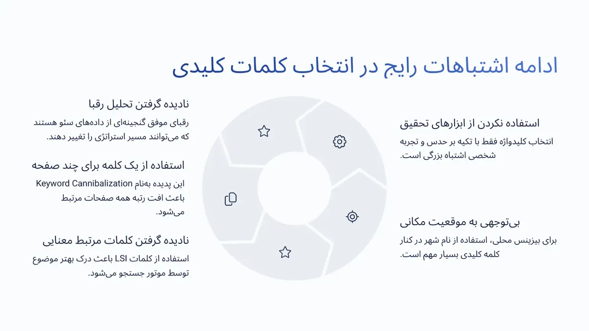 انتخاب کلمه کلیدی درست، زیربنای موفقیت در سئو و تولید محتواست. با این حال، بسیاری از افراد حتی با دانش اولیه یا متوسط در سئو، مرتکب اشتباهاتی میشن که به ظاهر سادهان، اما میتونن رتبه سایت رو به شدت تحت تأثیر قرار بدن. در ادامه با ۱۰ اشتباه رایج در انتخاب کلمات کلیدی آشنا میشیم که با پرهیز از اونها میتونی محتوایی تولید کنی که هم برای کاربر مفیده و هم برای موتور جستجو قابل درکه.