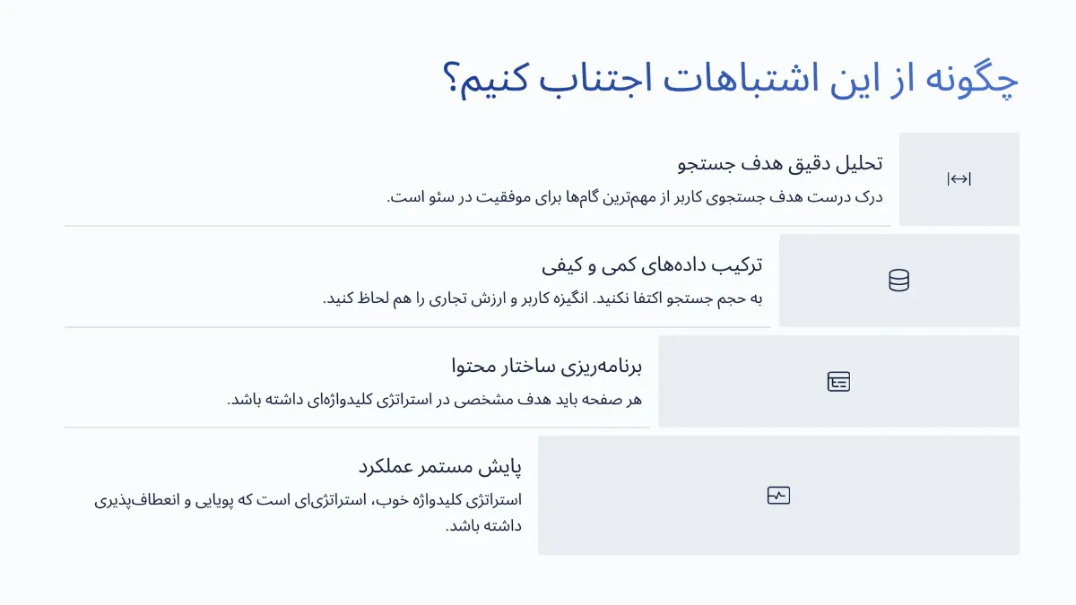 حالا که با اشتباهات رایج در انتخاب کلمات کلیدی آشنا شدی، وقتشه بدونی چطور میتونی از اونها فاصله بگیری و استراتژی کلمات کلیدی سایتت رو حرفهای و مؤثر بچینی. راهکارهایی که در ادامه معرفی میکنیم، بر پایه تجربیات عملی و اصول پیشرفته سئو طراحی شدهان و برای هر نوع سایت یا کسبوکاری قابل پیادهسازی هستن.