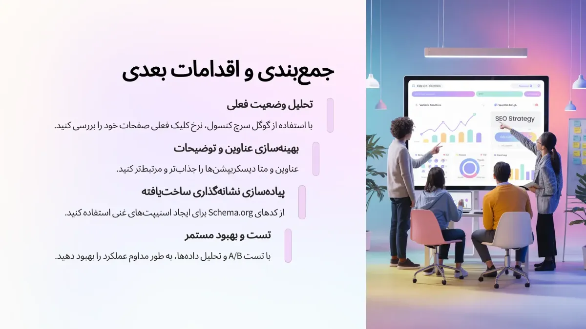 افزایش نرخ کلیک یک فرایند یکباره نیست و نیازمند بررسی، تست و بهبود مداوم است. با استفاده از ابزارهایی مانند Google Search Console و ابزارهای تحلیلی، میتوانید عملکرد عنوانها، متا دیسکریپشن و اسنیپتها را بسنجید و بفهمید کدام نسخهها بیشترین کلیک را جذب میکنند.