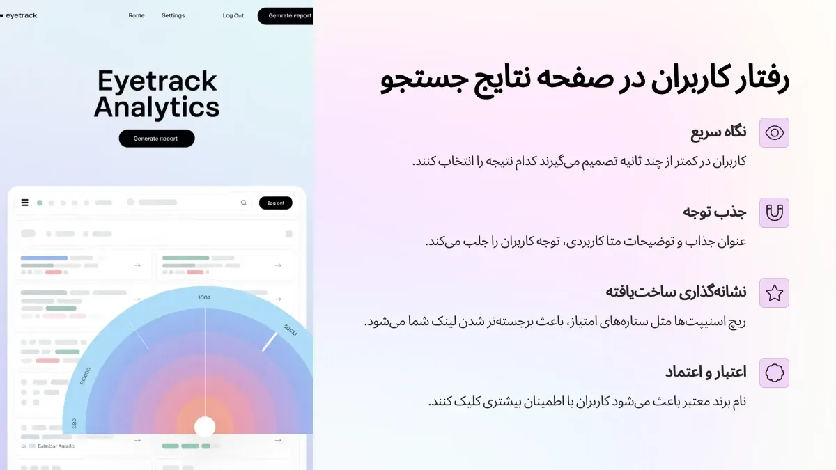 کاربران هنگام مشاهده صفحه SERP، ابتدا به عنوانها و توضیحات صفحات دقت میکنند. آنها به دنبال پاسخی سریع و مرتبط با نیازشان هستند و معمولا در کمتر از چند ثانیه تصمیم میگیرند کدام نتیجه را انتخاب کنند. بنابراین، درک نحوه نگاه کردن کاربران به نتایج و رفتارهای پنهان آنها اهمیت بالایی دارد. برای مثال، آنها معمولا چشمشان به سمت نتایجی میرود که عنوانی جذاب و توضیحی واضح و قابل فهم دارند.