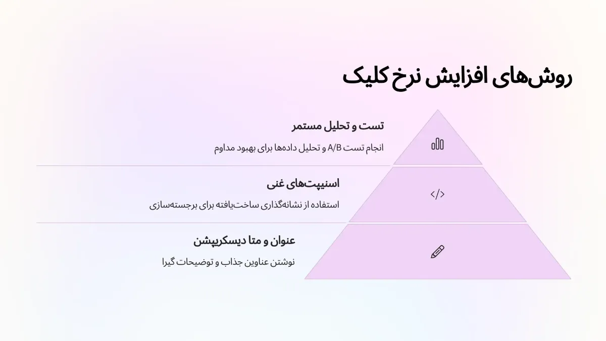 با پیادهسازی این روشها و نگاه دقیق به رفتار کاربران، میتوانید نرخ کلیک صفحات خود را به طور چشمگیری افزایش دهید و جایگاه بهتری در نتایج گوگل کسب کنید.