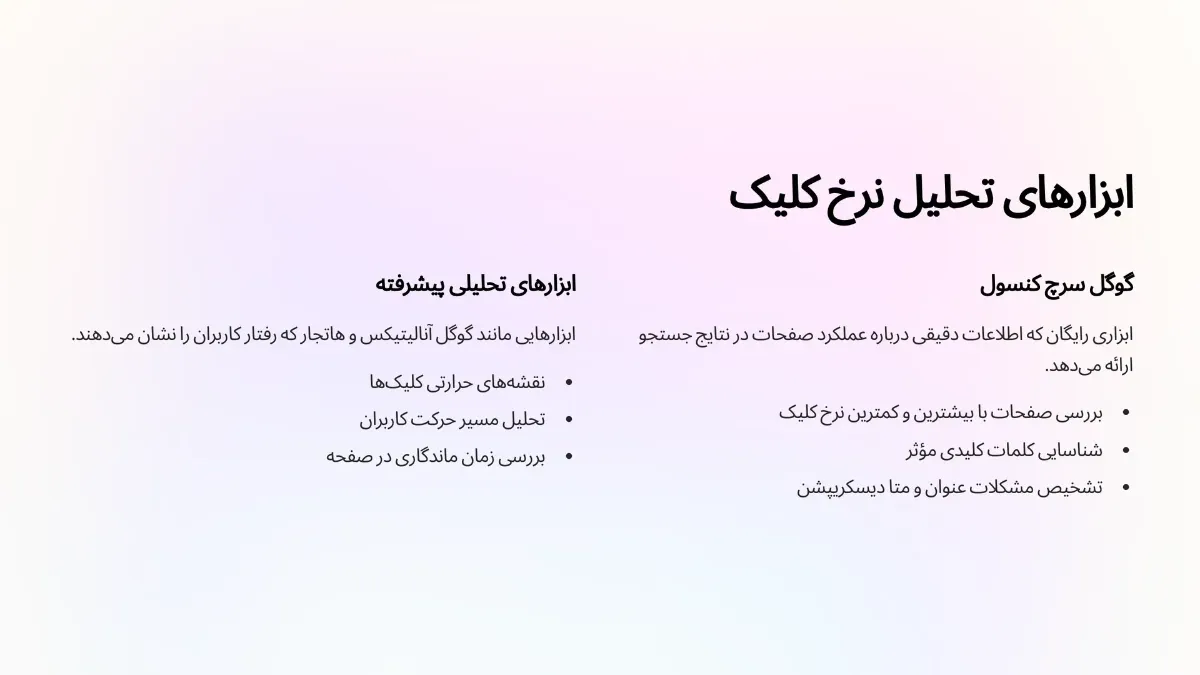 ترکیب دادههای این ابزارها با گوگل سرچ کنسول، دید جامع و عمیقی درباره رفتار کاربر و عملکرد صفحات شما ایجاد میکند که برای بهبود مستمر CTR حیاتی است.