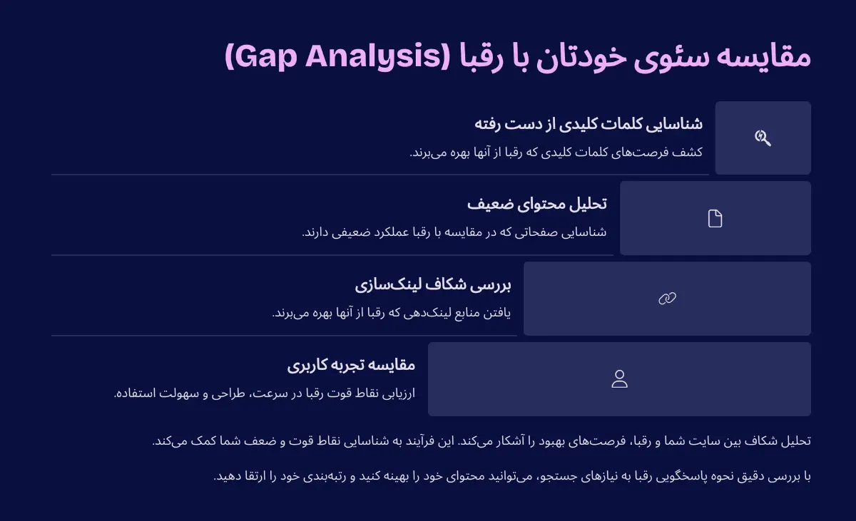 شناسایی شکافهای محتوایی (Content Gaps): متوجه شوید رقبای شما چه موضوعاتی را پوشش دادهاند که شما هنوز به آنها نپرداختهاید.