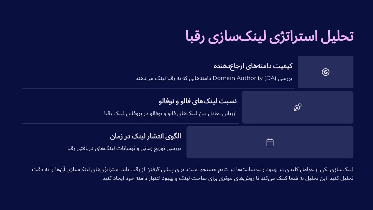 لینکسازی یکی از عوامل کلیدی در بهبود رتبه سایتها در نتایج جستجو است. برای پیشی گرفتن از رقبا، باید استراتژیهای لینکسازی آنها را به دقت تحلیل کنید. این تحلیل به شما کمک میکند تا روشهای موثری برای ساخت لینک و بهبود اعتبار دامنه خود ایجاد کنید. در این بخش، نحوه تحلیل استراتژی لینکسازی رقبا و فاکتورهای کلیدی که باید بررسی کنید، شرح داده میشود.