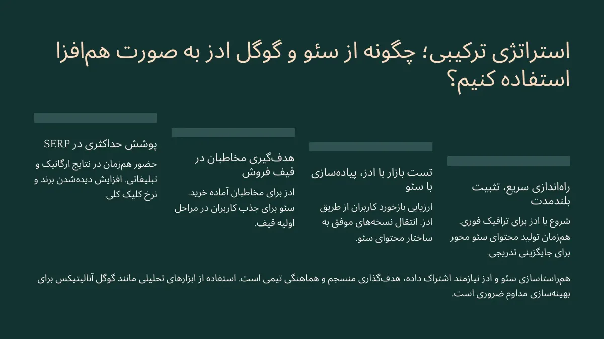 ترکیب هوشمندانه سئو و گوگل ادز، یعنی استفاده از گوگل ادز برای نتایج سریع و تاکتیکی، و بهرهبرداری از سئو برای نتایج پایدار و استراتژیک. این استراتژی ترکیبی منجر به: