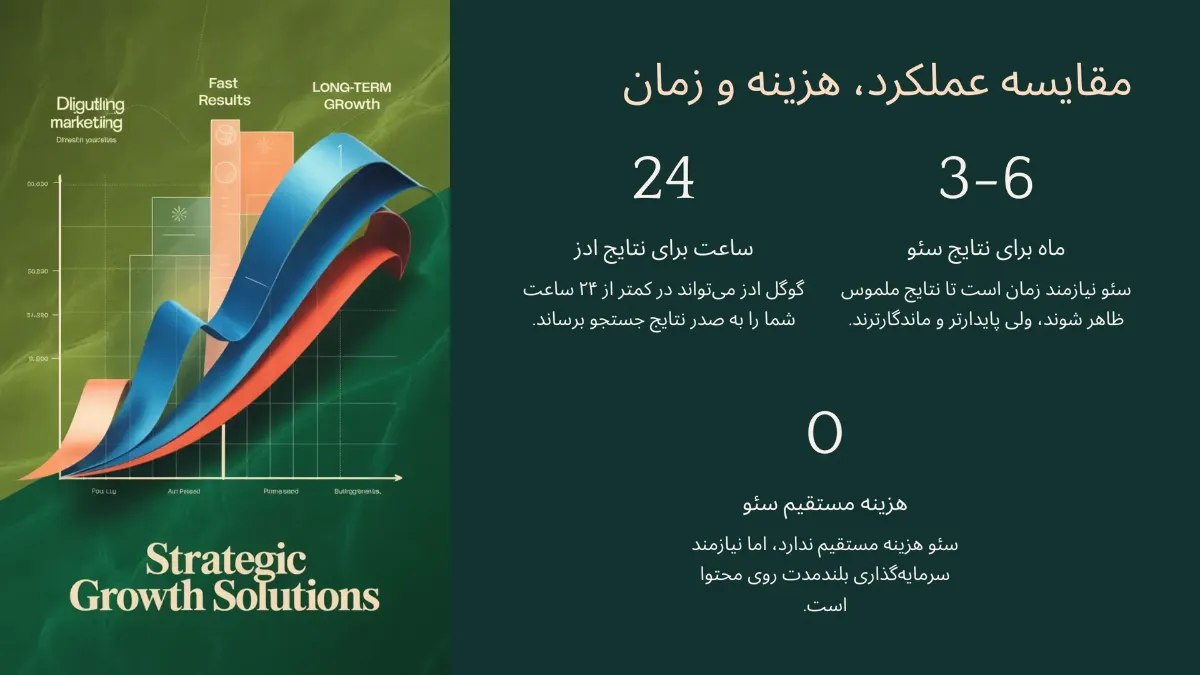 سئو معمولاً نیازمند ۳ تا ۶ ماه زمان است تا نتایج ملموس ظاهر شوند، ولی پایدارتر و ماندگارترند. در مقابل، گوگل ادز میتواند در کمتر از ۲۴ ساعت شما را به صدر نتایج جستجو برساند، البته تا زمانی که پرداخت ادامه دارد.