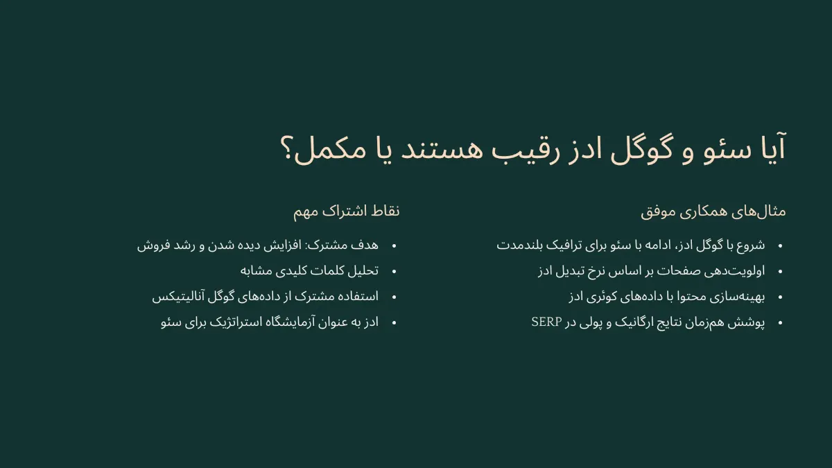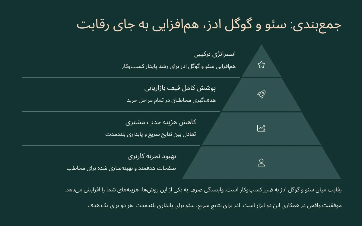 در نهایت، اگر بین رقابت و همکاری باید انتخابی صورت گیرد، همکاری سئو و گوگل ادز راهبردی است که به رشد واقعی و پایدار کسبوکار میانجامد.