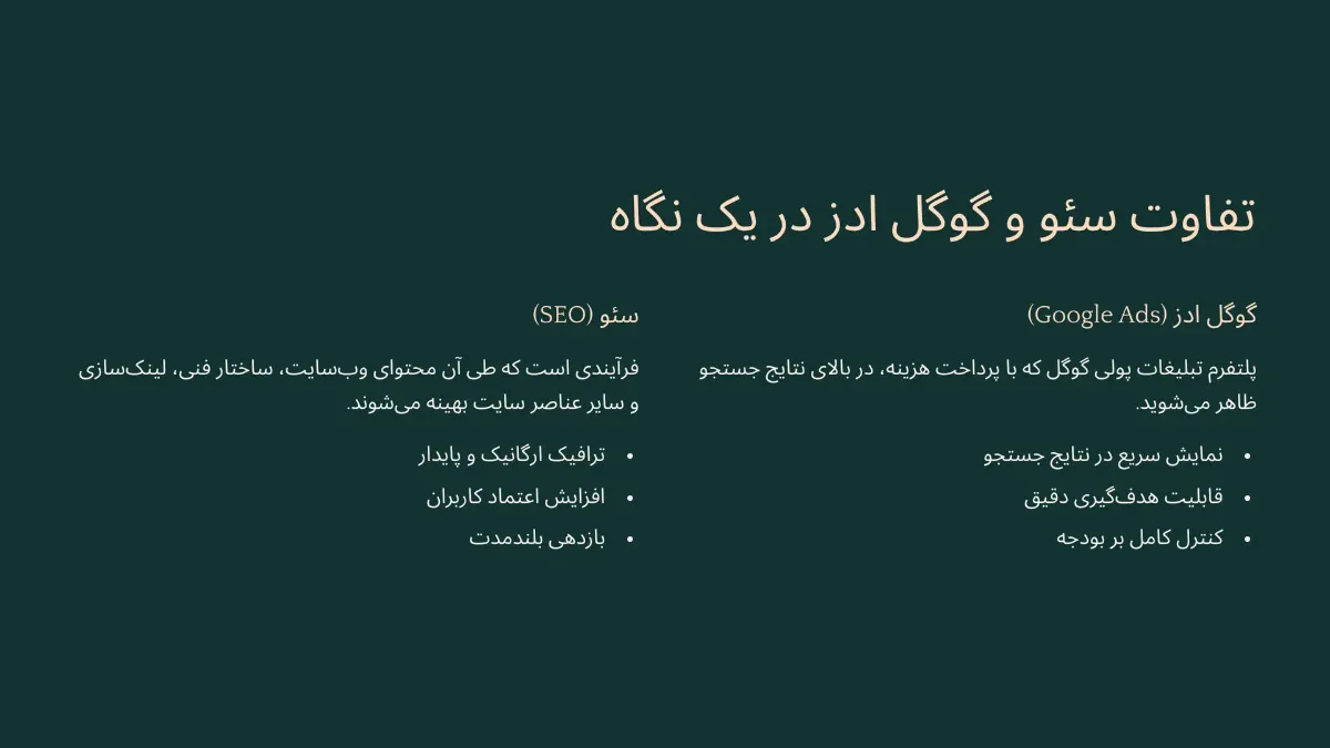برای پروژههایی با فوریت بالا، سئو بهتنهایی پاسخگو نیست. گوگل ادز در این موارد برتری دارد. اما اگر زمان دارید و به دنبال ساختن زیرساخت دیجیتال قوی و ماندگار هستید، سئو سرمایهگذاری هوشمندانهای است.