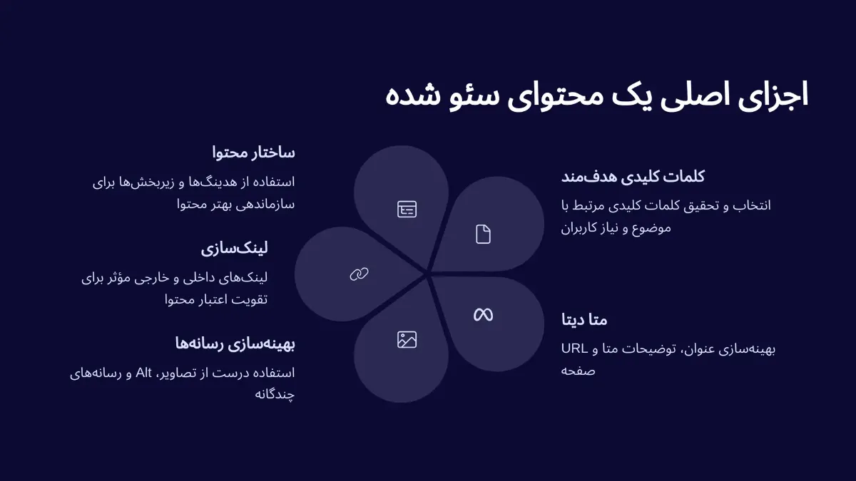 برای اینکه محتوای شما در نتایج جستجوی گوگل بهخوبی رتبهبندی شود و نیازهای کاربران را برآورده کند، باید از اجزای سئو شده بهرهمند باشد. یک محتوای سئو شده شامل مجموعهای از عوامل است که به بهینهسازی آن کمک میکنند، از انتخاب کلمات کلیدی گرفته تا ساختاردهی محتوا و بهینهسازی رسانهها. هر یک از این اجزا به نحوی در بهبود رتبهبندی گوگل و تجربه کاربری نقش دارند و باید بهطور دقیق و بهینه مورد توجه قرار گیرند.