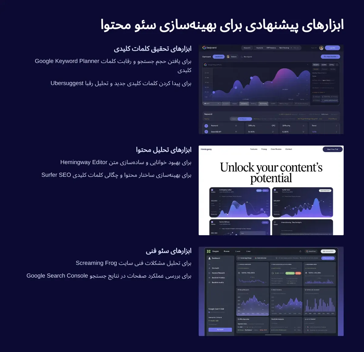 ابزارهایی مثل google keyword planner، surfer seo، hemingway editor و screaming frog کاربردی هستند.