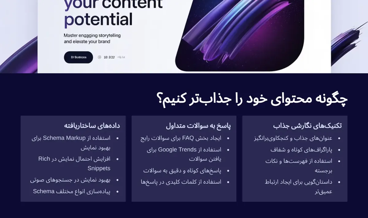 برای اینکه محتوای شما هم برای کاربران و هم برای موتورهای جستجو جذاب باشد، باید از تکنیکهای خاصی استفاده کنید که هم به ارتقاء تجربه کاربری و هم به رتبهبندی بهتر در گوگل کمک کنند. در این بخش، چند روش مؤثر برای جذابتر کردن محتوای خود آوردهایم که به شما کمک میکند تا محتوای باکیفیت و بهینهشدهای تولید کنید.