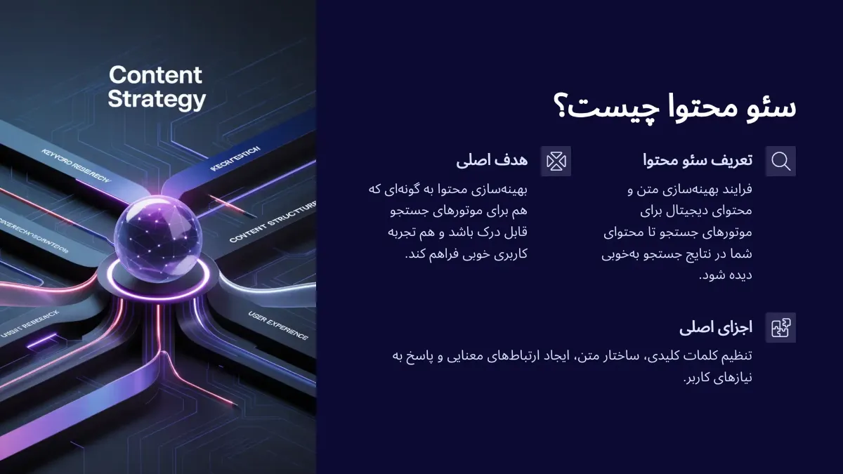 سئو محتوا به فرایند بهینهسازی متن و محتوای دیجیتال برای موتورهای جستجو گفته میشود تا محتوای شما در نتایج جستجوی گوگل و سایر موتورهای جستجو بهخوبی دیده شود. این فرآیند شامل تنظیم کلمات کلیدی، ساختار متن، ایجاد ارتباطهای معنایی بین اطلاعات و پاسخ به نیازهای کاربر است. هدف از سئو محتوا این است که محتوای شما به گونهای بهینهسازی شود که نه تنها برای موتورهای جستجو قابل درک باشد بلکه تجربه کاربری خوبی را نیز فراهم کند.