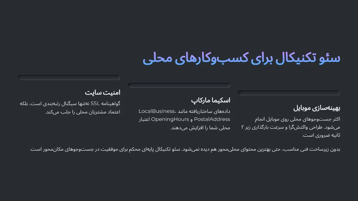 بسیاری از صاحبان کسبوکار تصور میکنند سئوی محلی فقط به ساخت پروفایل در Google Maps یا تولید محتوای بومی محدود میشود. اما واقعیت این است که زیرساخت فنی سایت یا همان سئو تکنیکال (Technical SEO)، نقشی اساسی در رتبهگیری شما در نتایج جستوجوی محلی دارد. بدون بهینهسازی فنی، حتی بهترین محتوای محلی هم ممکن است دیده نشود. در ادامه به مهمترین جنبههای تکنیکال که تأثیر مستقیم بر سئو محلی دارند میپردازیم: