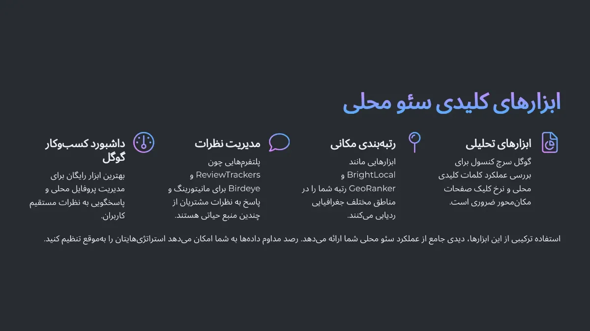 اgoogle search console، google business profile، و ابزارهای local rank tracking مثل brightlocal یا whitespark.