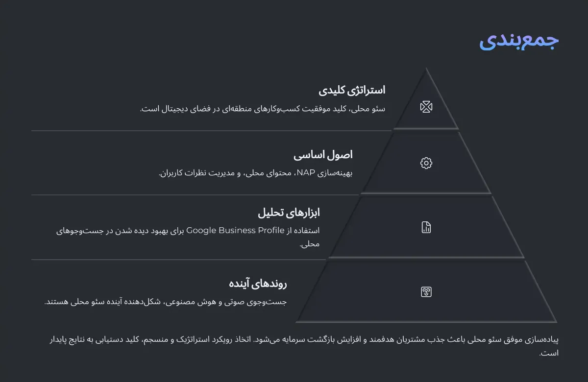 سئو محلی به عنوان یکی از مهمترین استراتژیهای بهینهسازی برای کسبوکارهای منطقهای، به کسبوکارها کمک میکند تا در نتایج جستوجوی محلی به بالاترین رتبه دست یابند. با درک و پیادهسازی اصول سئو محلی، نظیر بهینهسازی اطلاعات NAP، تولید محتوای محلی، مدیریت نظرات کاربران و استفاده از ابزارهای تحلیل مانند Google Business Profile، کسبوکارها میتوانند موفقیت بیشتری در جذب مشتریان محلی داشته باشند. همچنین، روندهای نوظهور مانند جستوجوی صوتی و استفاده از هوش مصنوعی در شخصیسازی نتایج جستوجو، اهمیت بیشتری در آینده سئو محلی پیدا خواهند کرد.
