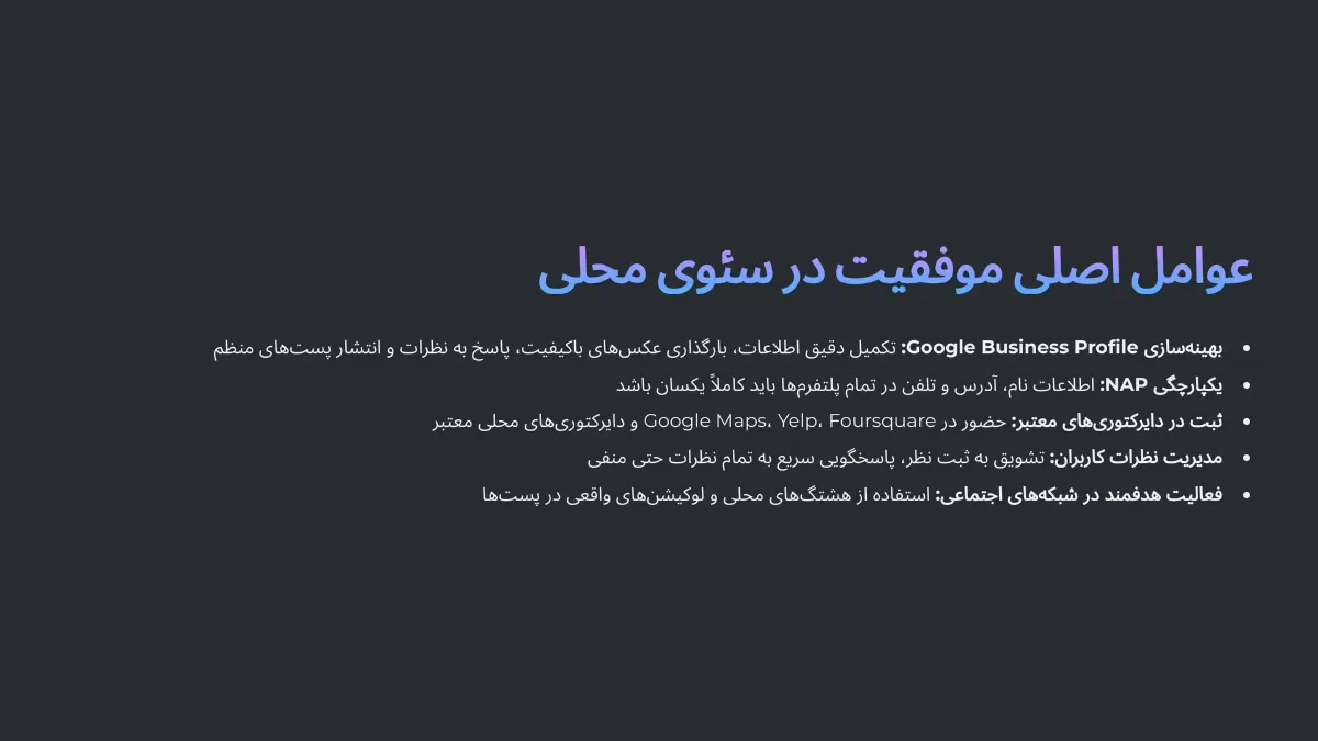 موفقیت در سئو محلی تنها به حضور در Google Maps خلاصه نمیشود. برای اینکه در نتایج جستوجوی محلی بدرخشید و از رقبا جلو بزنید، باید مجموعهای از فاکتورهای کلیدی را بهصورت منظم، حرفهای و استراتژیک پیادهسازی کنید. در این بخش، مهمترین عوامل مؤثر در موفقیت سئو محلی را بررسی میکنیم.