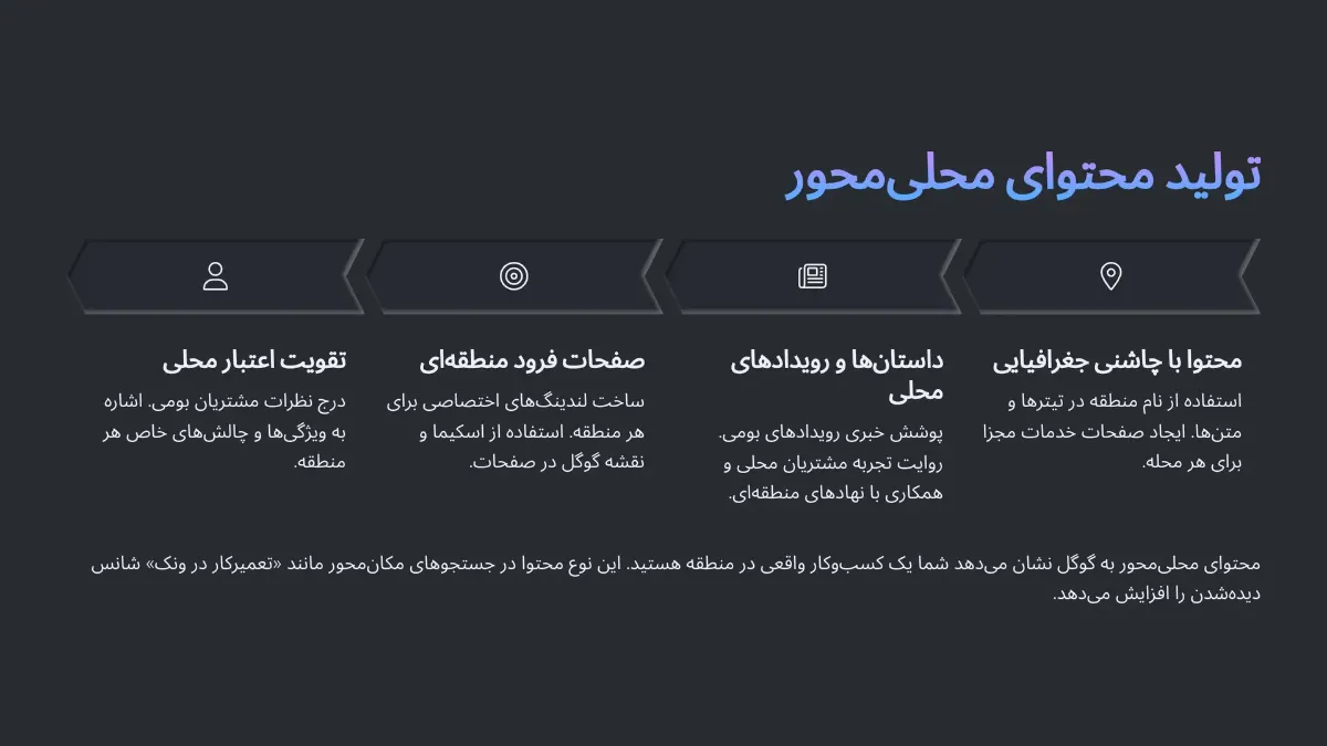 این نوع محتوا باعث میشود در جستجوهایی مثل «خدمات نظافت منزل در شهرک غرب» یا «فروشگاه گل در تجریش» شانس حضور در نتایج اول گوگل را داشته باشید.
