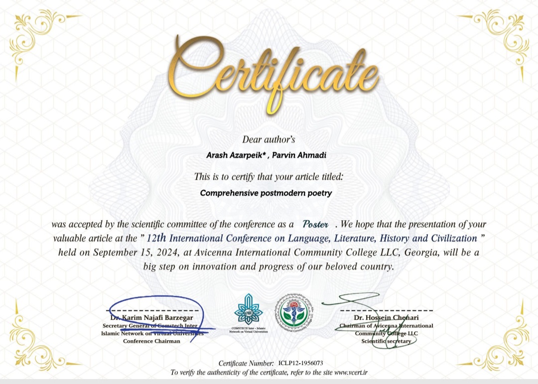 پذیرفته شده در دوازدهمین کنفرانس بینالمللی زبان، ادبیات، تاریخ و تمدن/ گرجستان، دانشگاه ابنسینا/ ۲۵ شهریور ۱۴۰۳