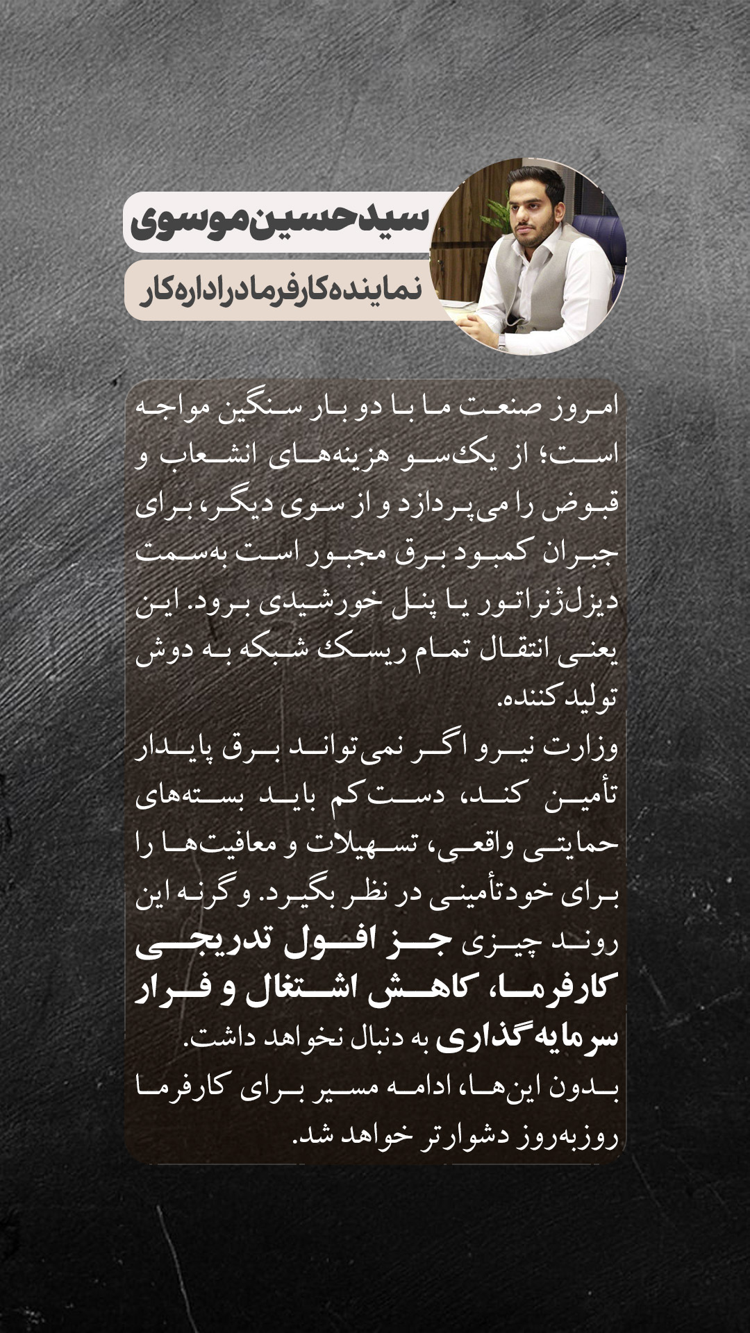 بدون اقدام فوری و زیرساختی، ادامه مسیر برای کارفرما روزبهروز دشوارتر خواهد شد—و تنها افول تدریجی، کاهش رشد اقتصادی و فرار سرمایه در پیش خواهد بود.