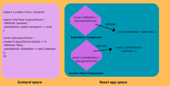 حالا از این ببعدش جالب میشه، شما وقتی zustand رو به طور مثال در برنامه react تون استفاده میکنید یه wrapper ای از جنس stateهای react دورش ایجاد میشه که فرآیندهای آپدیت و rendering در react بدین وسیله handle میشه.