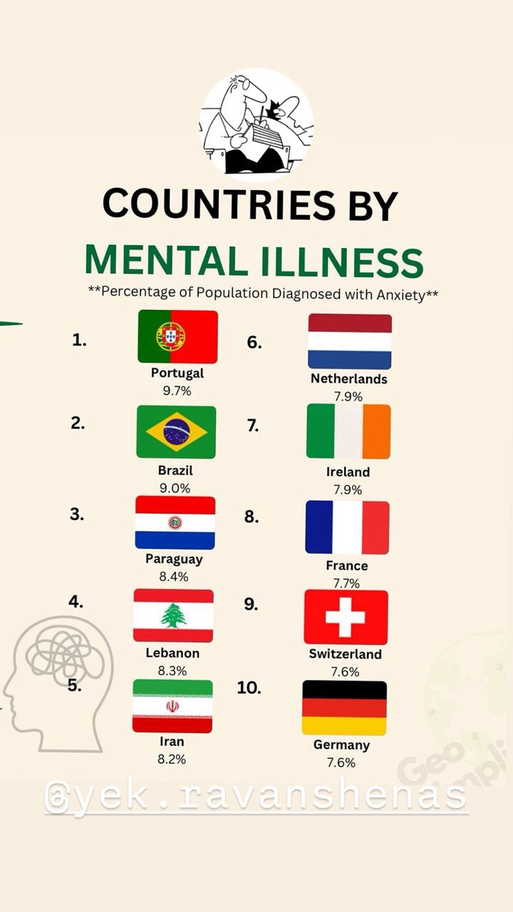 بر اساس دادههای منتشرشده از سوی Geo Simplified، ایران با حدود ۸.۲ درصد جمعیت مبتلا به اختلالات اضطرابی، در جایگاه پنجم جهان قرار گرفته است. در صدر این فهرست، پرتغال با ۹.۷ درصد و پس از آن برزیل، پاراگوئه و لبنان قرار دارند.