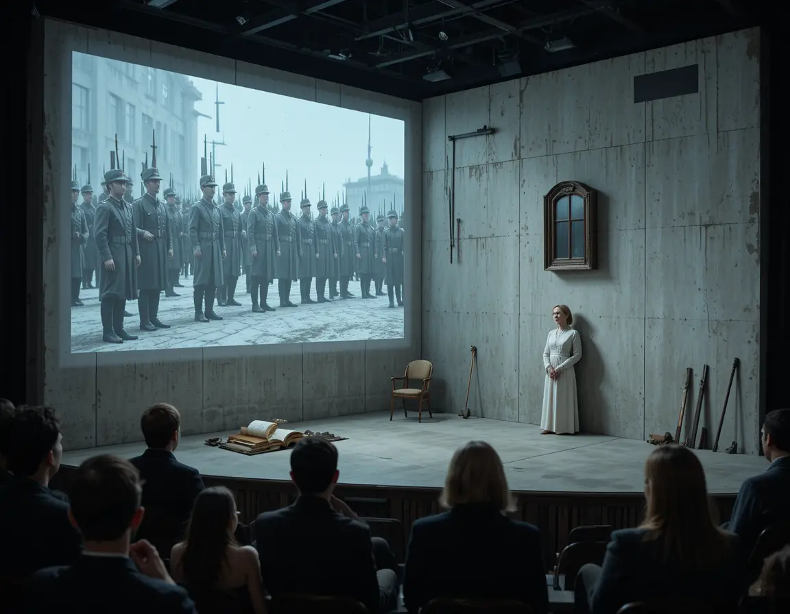 علاوه بر کتاب، یک مثال دیگر میتواند رفتار کاراکترها در طول اجرا باشد: مثلاً یک کاراکتر در نقش قاضی چند بار روی صحنه ابزار یا صندلیای را به یک حرکت تکراری اما دقیق جا به جا میکند. در ابتدا مخاطب فقط یک رفتار ساده میبیند، اما بعد از چند بار تکرار، همین حرکت به نمادی از خستگی، وظیفه، دگماتیسم یا تمرکز شخصیت تبدیل میشود. معنا از دل تکرار و تعامل کاراکتر با صحنه شکل میگیرد، نه از ارجاع بیرونی یا توضیح مستقیم.