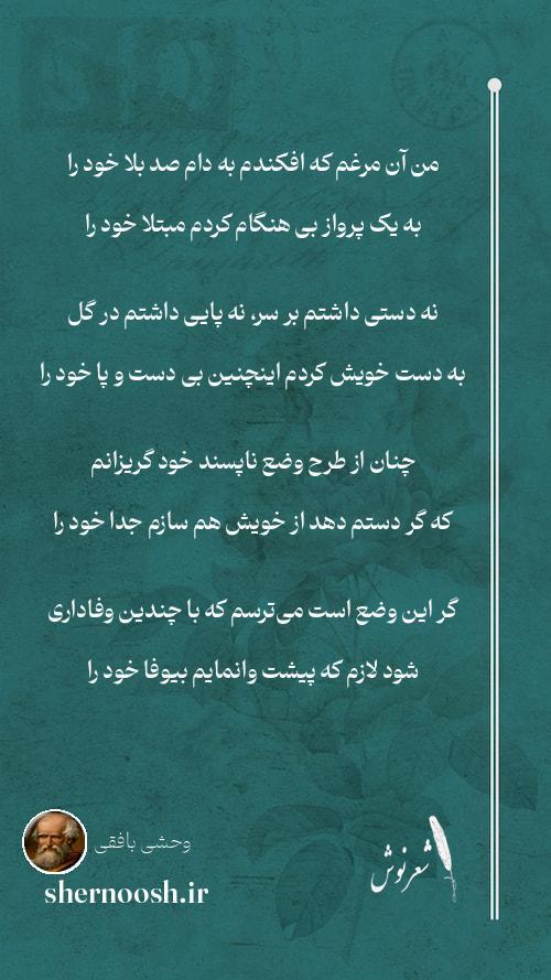 وحشی بافقی، شاعر بزرگ قرن یازدهم هجری، از جمله شاعرانی است که زندگیاش سرشار از رنج، فقر و محرومیت بود. او در شهر بافق یزد متولد شد و تمام عمر را در تنگدستی و بینوایی به سر برد. اما آنچه بیش از فقر مادی، روح او را آزار داد، عشقی نافرجام بود که تا پایان عمر در دل داشت. غزل با مطلع "من آن مرغم " یکی از صادقترین و دردناکترین اعترافات یک عاشق سرگردان است که در دام عشقی گرفتار آمده که نه امید وصال دارد و نه امکان رهایی.در این غزل، وحشی با زبانی ساده اما عمیق، از پشیمانی، خودسرزنشی، بیزاری از خود و سرانجام نومیدی مطلق میگوید. او خود را مقصر اصلی رنجهای خویش میداند و این خودآزاری روانی، سنگینتر از هر محرومیت دیگری است. در این مقاله، هر بیت از این غزل را جداگانه بررسی میکنیم تا ببینیم عشق نافرجام چگونه میتواند انسان را از درون بسوزاند و به ورطه نابودی بکشاند.