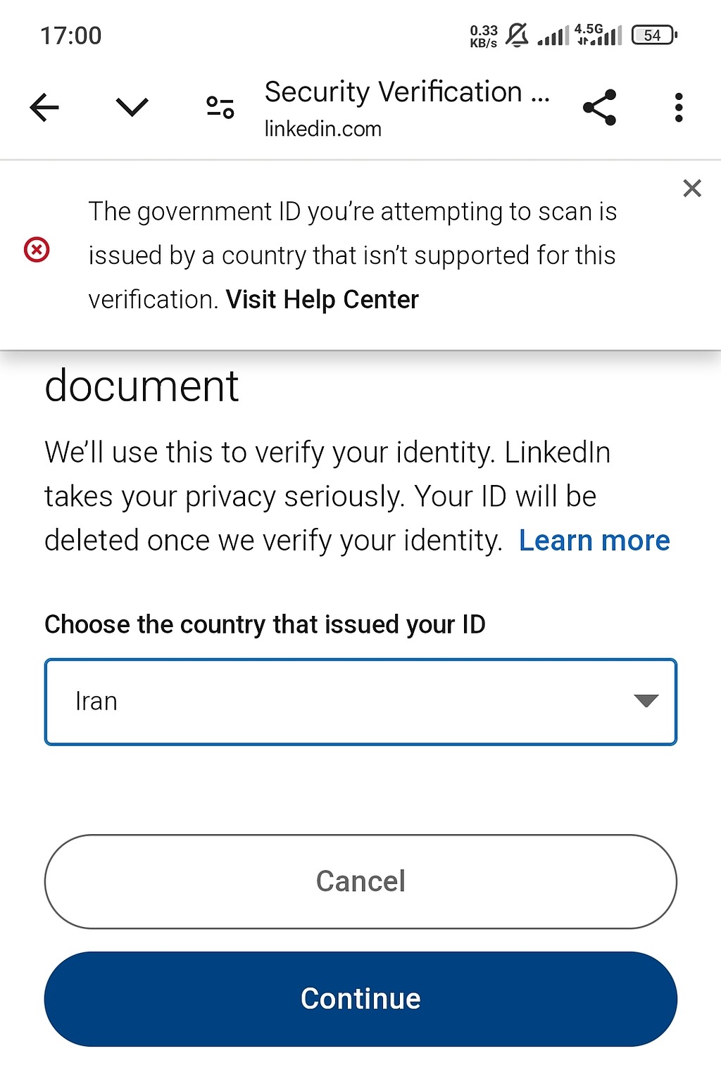 I attempted to upload my government ID via the secure link you provided, but the page shows this message: “The government ID you’re attempting to scan is issued by a country that isn’t supported for this verification.” (See attached screenshot.) Because I reside in Iran, the automated ID-upload system does not accept Iranian passports or national IDs. Please advise an alternative verification method. I am ready to: • Sign the LinkedIn Affidavit of Identity before a licensed Notary Public and upload the notarized scan. • Provide supporting documents (utility bill, university certificate, etc.). Please let me know which option works for your team or if there is another secure way to submit my documents. Thank you so much for your help.