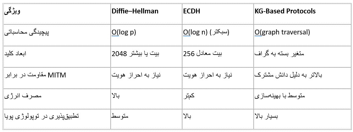 پروتکل DH سنتی از منظر امنیت ریاضی قدرتمند باقی میماند اما نیاز به احراز هویت خارجی و مصرف بالای انرژی، محدودیتهایی ایجاد میکند. در واقع ترکیب DH یا ECDH با لایه احراز هویت مبتنی بر گراف دانستنیها میتواند راهکار ترکیبی مناسبی باشد که در پژوهشهای آینده باید بررسی شود.
