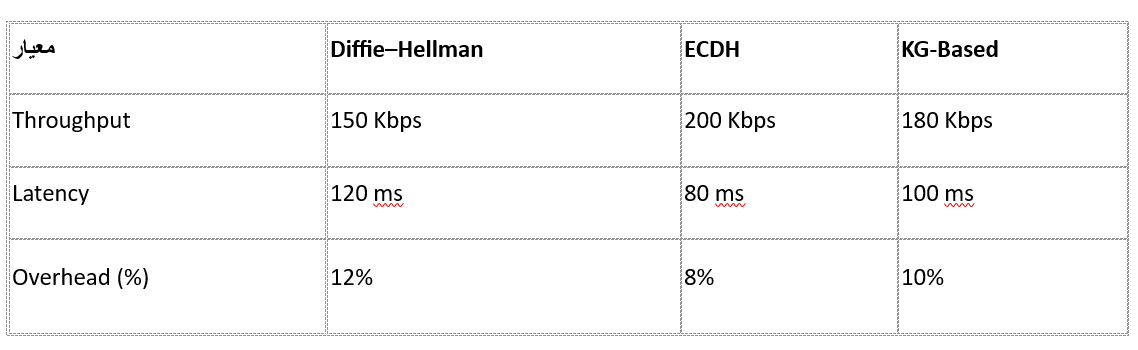 نتایج نشان میدهد که ECDH به دلیل ابعاد کلید کمتر و پیچیدگی پایین، بهترین عملکرد را در محیطهای پویا دارد. پروتکلهای مبتنی بر KG نیز بهخوبی عمل کردهاند و به لطف ساختار معنایی توانستهاند تأخیر و سربار منطقی را حفظ کنند.