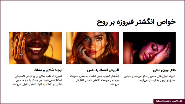 نوع سنگ فیروزه ویژگیها و خواص معنوی فیروزه ایرانی انرژی محافظتی و شفا بخش، جذب انرژیهای مثبت و تقویت اعتماد به نفس فیروزه مکزیکی خاصیت آرامش بخش، بهبود روابط اجتماعی و جذب برکت فیروزه چینی تقویت قدرت ذهنی و تسهیل در تصمیمگیری، افزایش تمرکز و تعادل روانی فیروزه آمریکایی حمایت از فرد در برابر استرس، بهبود تعادل در زندگی روزمره