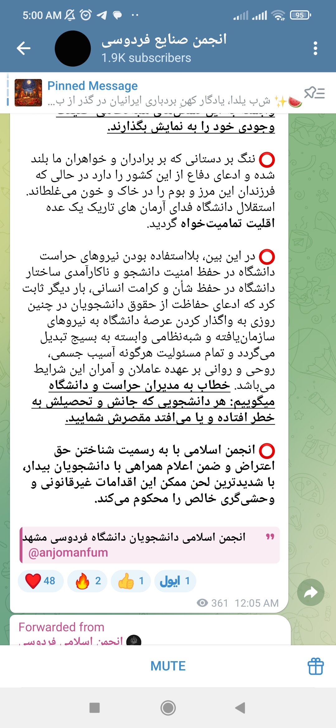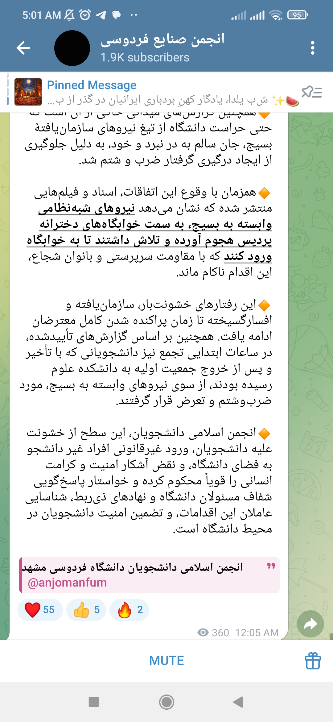 چهارم اینکه ادعا شده طبق فیلم های موجود این متن نوشته شده درصورتی که فیلمی در این کانال بارگزاری نشده. البته نکته ظریف اینجاست که این پیام ها در کانال انجمن علمی صنایع وجود دارد و از کانال انجمن اسلامی فوروارد شده درحالی که اکنون درخود کانال انجمن اسلامی موجود نیست و پاک شده است.