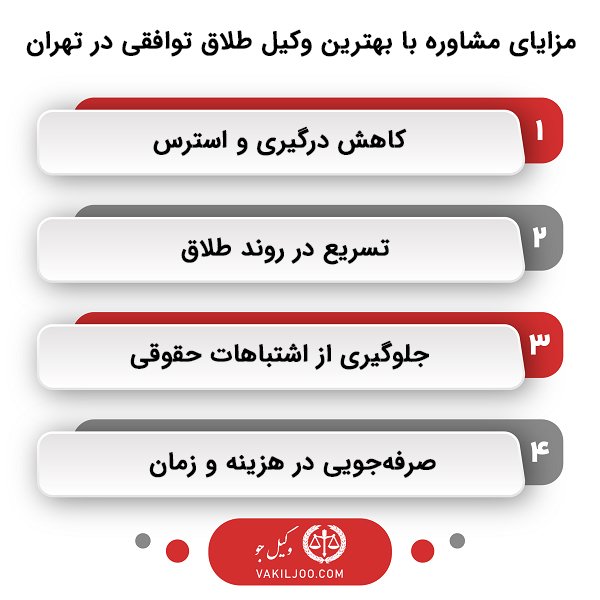 انتخاب بهترین وکیل طلاق توافقی در تهران به زوجین کمک میکند که توافقنامهای دقیق، قانونی و با حفظ منافع طرفین تنظیم کنند؛ به طوری که تمام مسائل از مهریه گرفته تا حضانت فرزندان را پوشش دهد و مانع بروز اختلافات و مراجعات قضایی در آینده شود؛ البته توجه به تخصص و تجربه وکیل در پروندههای طلاق توافقی و هزینه دریافتی او باید در نظر گرفته شود تا با اطمینان خاطر مراحل طلاق توافقی به پایان برسد.