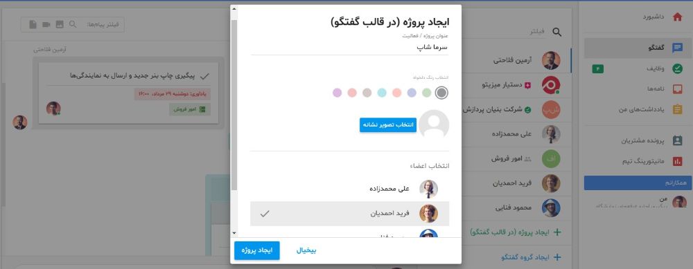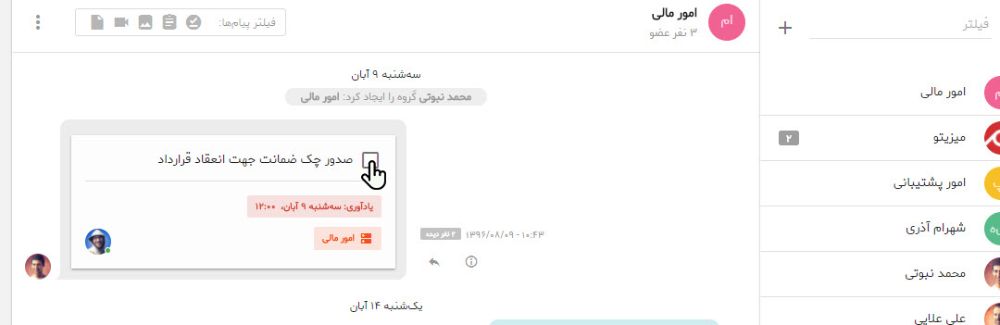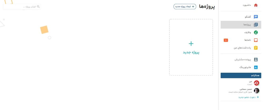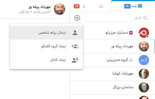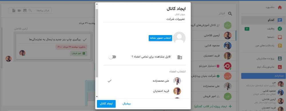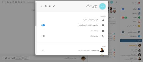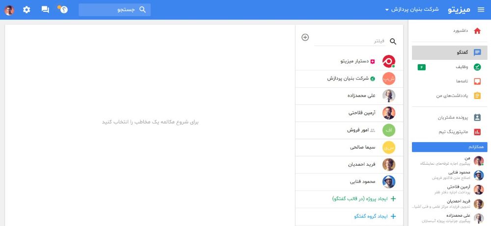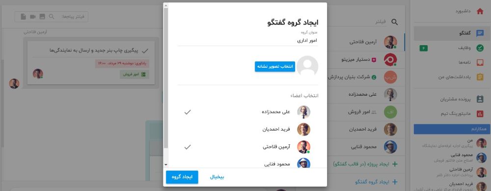 در این قسمت شما میتوانید با ارسال لینک دعوت همکاران جدید خود را به گروه اضافه کنید . همچنین امکان چت با همکاران خود چه فردی و چه گروهی وجود دارد .