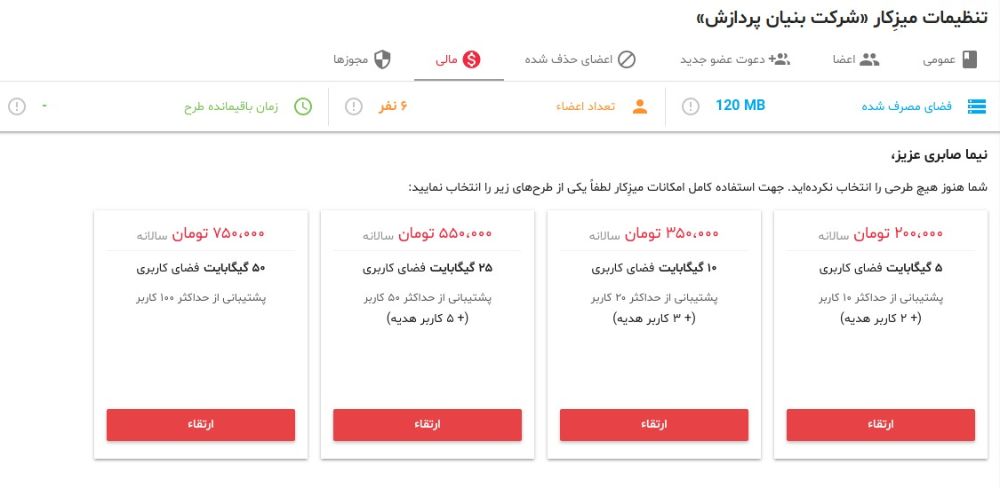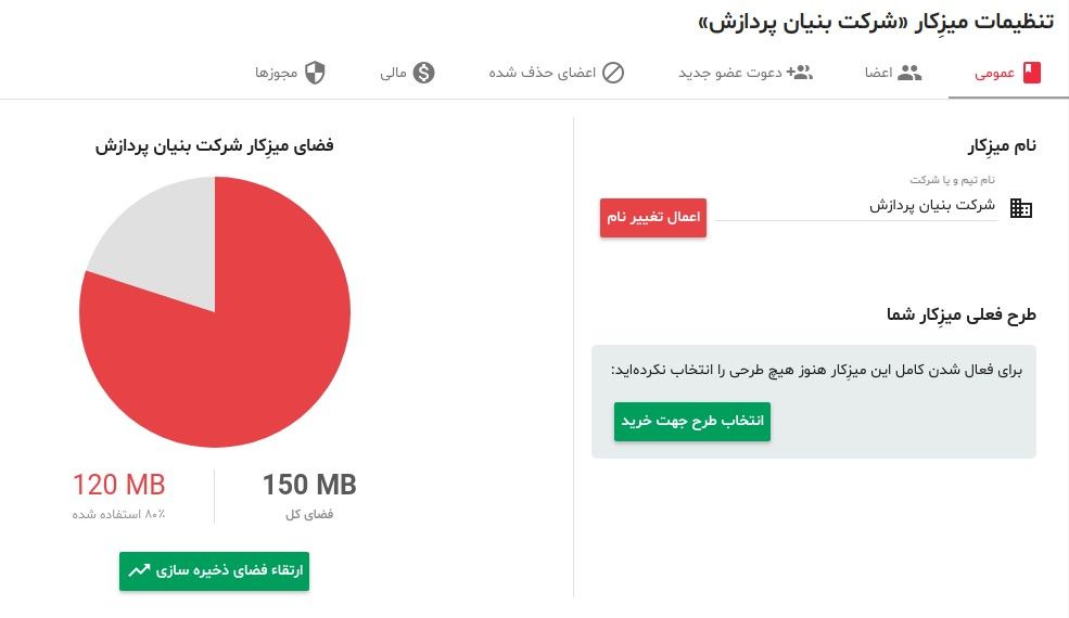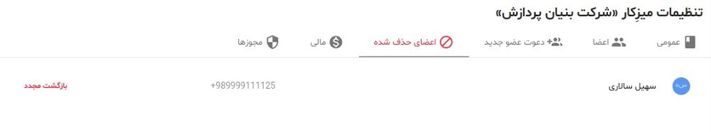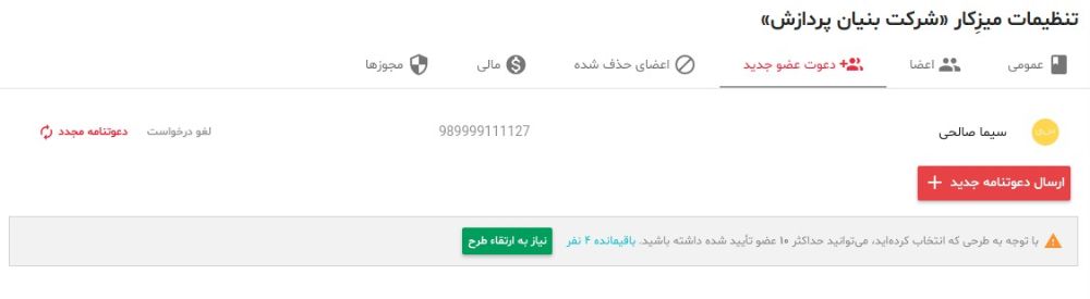 اعضا: این قسمت نشاندهنده افرادی است که دعوت شما را برای ورود به میزِکارتان پذیرفتهاند و در واقع عضو آن شدهاند. در این بخش شما امکان تعیین سطح دسترسی افراد و نیز حذف آنان را دارید.